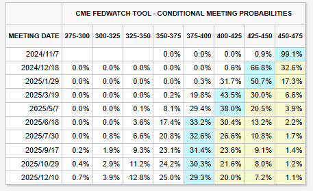 由于通胀预期的上行风险,交易员调降了对美联储2025年降息的预期,这也是美债利率和美元指数走高的主要原因之一。芝商所的“美联储观察”工具显示,市场预计该行降息周期的终点在3.75%-4.00%。