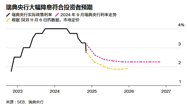 值得注意的是,当晚瑞典央行将基准利率降至2.75%,并表示可能在12月和2025年上半年进一步下调。这是瑞典央行十年来首次将利率下调50个基点,以加速对停滞经济的支持,并承诺未来将采取更多措施。