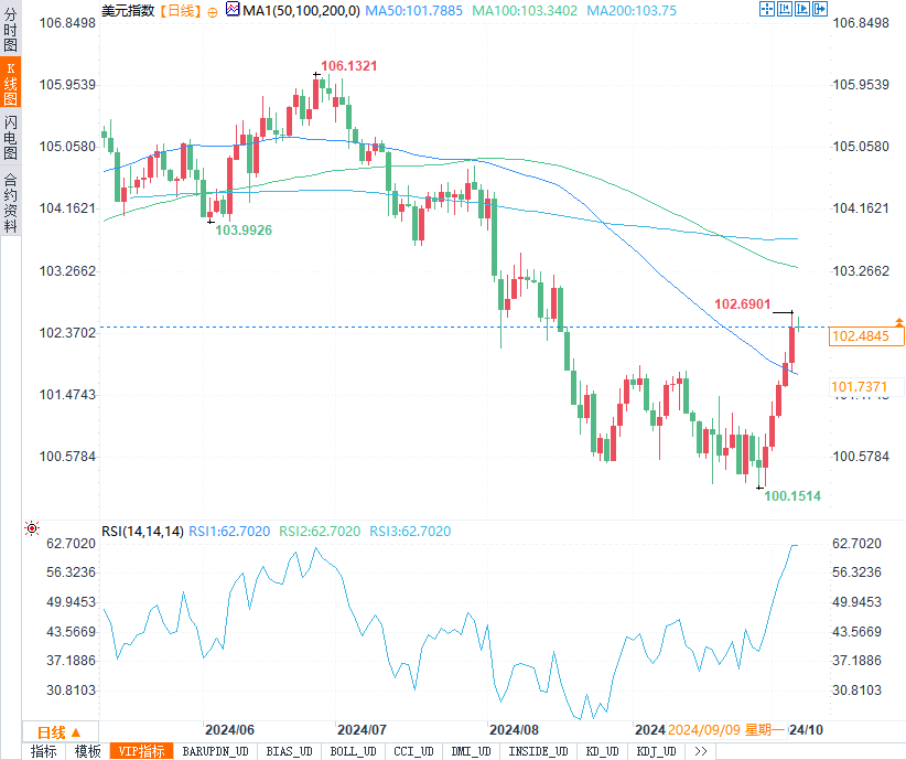 美元指数在本周继续巩固涨势,达到102.60的水平。这一数字接近上周五的七周高点102.69,显示出美元在过去几天内的显著回升。本周迄今,美元指数已上涨超过2%,为两年来的最大周涨幅之一。值得注意的是,美元指数上周初曾略高于100,显现出在100.00水平附近的坚实支撑。三菱日联金融集团(MUFG)指出,美元指数多次尝试跌破100.00关口未果,这一趋势类似于2023年7月的走势。那时,美元指数试探性触及100.00的水平后,随即在接下来的三个月内出现了强劲的反弹,涨幅高达7.8%。这种技术性反弹表明,当前的100.00关口将继续充当美元的强力支撑位。