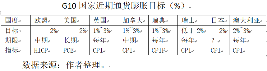 G10国家都实行通货膨胀目标制度,所有国家选择2%所谓最优通货膨胀目标。但一些国家选择通货膨胀目标达成期限是一年内,一些国家选择中期,一些国家选择长期(一般认为是预测区间3年)。