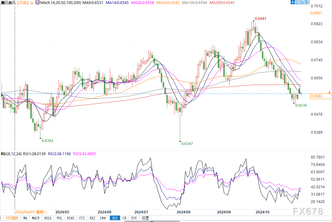 澳元兑美元日线图北京时间11月5日9:30,澳元兑美元报0.6583/84