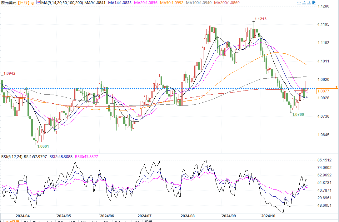北京时间11月5日11:45,欧元兑美元报1.0875/76。