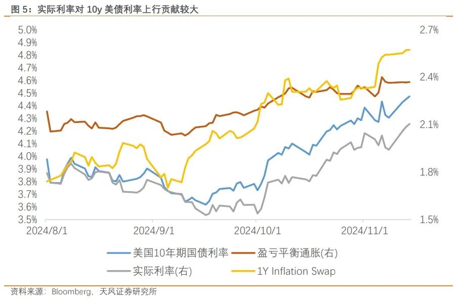 这也为美国长端利率放置了一个隐形的底:相信特朗普能带来“三高大循环”的投资者正持续交易出更高的实际利率以反映更强的未来经济增速,而认为特朗普会先引发明显再通胀的投资者则会进一步推高通胀预期。