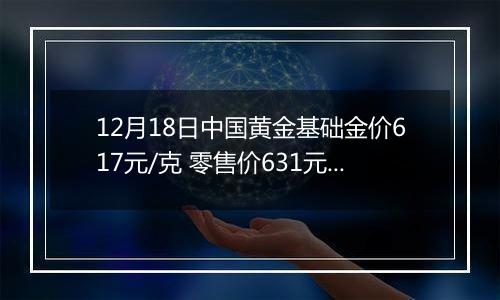 2024年12月18日,实物黄金中国黄金基础金价报价617元/克,相比上一个交易日下跌了2.6元/克。零售价今天报价631元/克,相比昨日下跌了2.6元/克。回购价今日价格615元/克,相比昨日下跌了2.6元/克。...